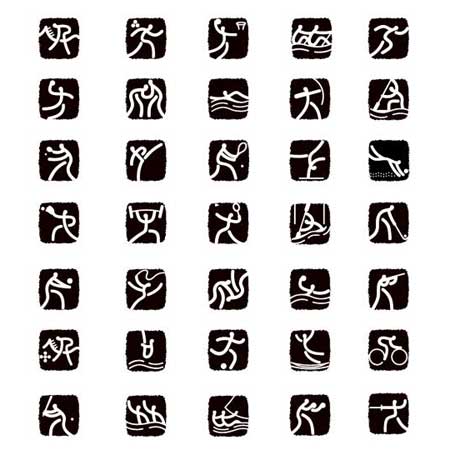北京奥运会体育图标以篆字笔画为基本形式,融合中国古代甲骨文、金文等文字的象形意趣和现代图形的简化特征。“篆”有“圆转”之意,圆润流畅、秀美典雅、刚柔并济,集中体现了中国传统美学精华与神韵。它不仅符合体育图标易识别、易记忆、易使用的简化要求,更通过其特有的形态动势将体育图标的运动特征和丰富的文化内涵高度凝练,达到了形与意的和谐统一。图标运用强烈的黑白对比效果,不但有单线标准形,还有拓片形式,与会徽的“中国印”有同一性。“图标不但有强烈中国文化特色,而且十分简练,是传统文化与现代设计的完美结合。