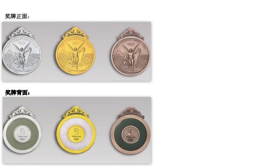 北京2008年奥运会奖牌直径为70毫米,厚6毫米。奖牌正面为国际奥委会规定图案——插上翅膀站立的希腊胜利女神和希腊潘纳辛纳科竞技场,背面则镶嵌着取自中国古代龙纹玉璧造型的玉璧,背面正中的金属图形上镌刻着北京奥运会会徽“中国印”。奖牌挂钩由中国传统玉双龙蒲纹璜演变而成。整个奖牌中国特色浓郁,既体现了对获胜者的礼赞,也形象诠释了中华民族自古以来以“玉”比“德”的价值观,可谓“中西合璧”。