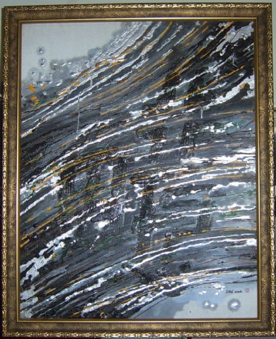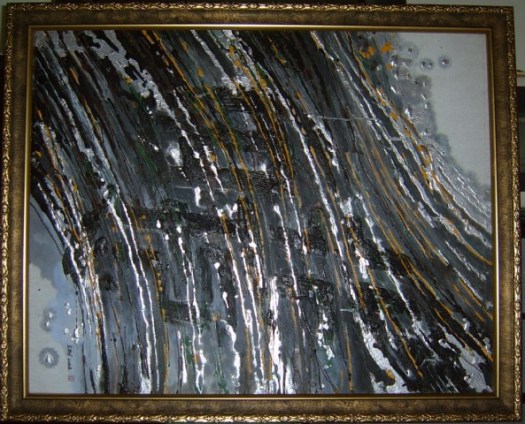 这幅油画我看颇有现代派的味道,画中隐隐约约能看到四个字:《行于心田》,我也把这四个字看做是这幅油画名称。我喜欢这画的意境,也喜欢它的波纹线条和色块。看到它,我便会想到“行成于思”、“心潮澎湃”、“心潮逐浪高”……