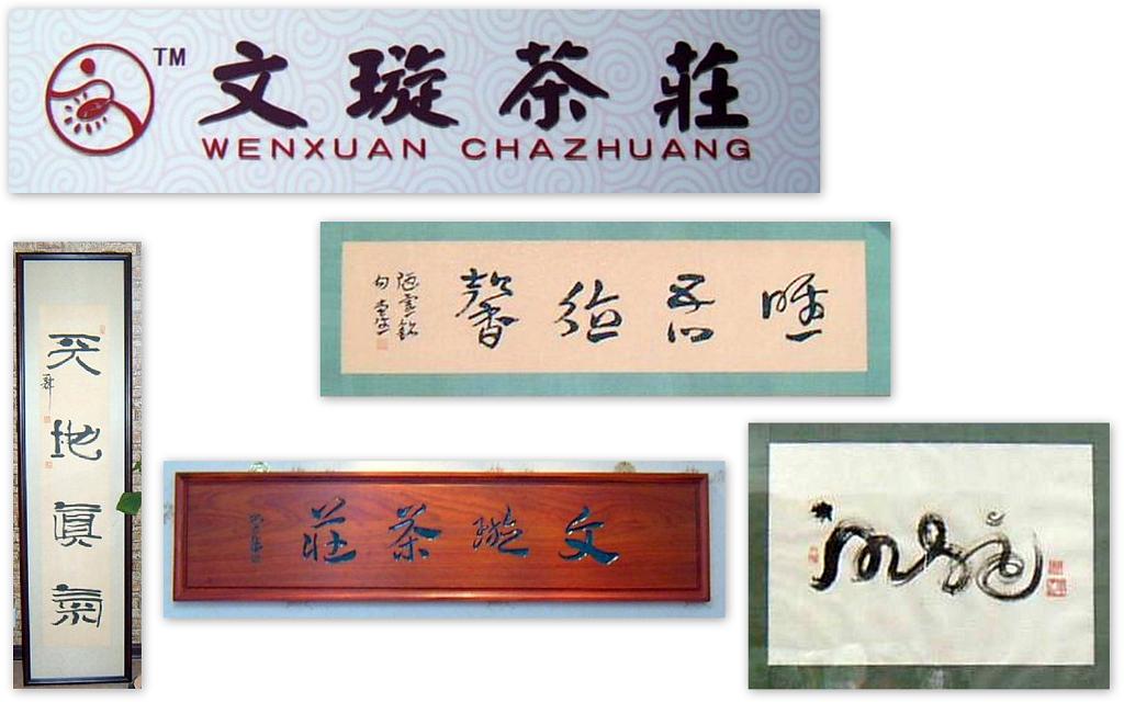 清明节回家,也受邀与白及大哥到南靖侄女家,参观了乔迁又装修焕然一新的《文璇茶庄》,受到 了热情款待,当然也喝了好茶,只是还没学会品茶之功夫。这装修是平和一群美术家所设计,颇为典雅大方、特色尽显。茶庄有两个店面,其中一个店堂摆设《哈德 龙茶》等品牌佳茗与一些名酒,还有一张巨型泡茶专用台;另一店堂布置成接待贵宾的雅室。雅室当然也泡茶,摆有几盆生气盎然的花卉及液晶电视。不过更引人注 目的还是那几幅各具特色的字(下列所示)。