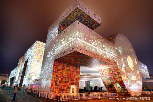 韩国馆外观。主题为“和谐城市,多彩生活”。韩文被直接体现在韩国馆的外观设计之中,韩文特有的几何特征也在建筑上得到完美阐释。