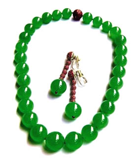 这个“珠圆玉润”套件由29颗圆润翠绿的老坑玻璃种珠粒项链和两颗耳坠共计31颗组成的,所有珠子全部取自一块石料,色泽匀称完整,是难得的珍品。但其价格也高得离谱,达6000万人民币。