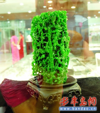 这款天价翡翠摆件来自云南,保守估计价值在9800万元,它刚一亮相展会,就引来各地的玉石收藏家、中外游客及岛城市民 前来观看。