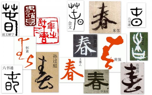 想到“春”字,便拼了一张“春”字图:有来自《六书通》、《说文解字》;有甲骨文、金文;有王羲之、颜真卿、孙过庭、怀素、伊秉绶、黄慎、张瑞图……