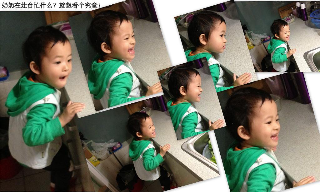 有一天她自己玩着无趣了,便跑到厨房,问奶奶在干什么?又开始连珠炮发问了。同时,更是脚踩抽屉把手,两手抓攀灶台边缘,似乎拼尽吃奶的力气,就想看奶奶在水槽里究竟忙些啥?其神态实在可爱。于是,我说时迟那时快,拿起手机抓拍了几张……