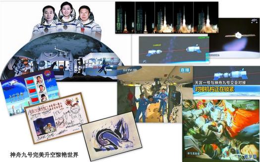 2012年6月16日18时37分,神舟九号飞船发射升空,中国航天员飞往“天宫” ;6月18日下午14时许,中国第一个空间实验室——天宫一号目标飞行器与搭载景海鹏、刘旺、刘洋三名航天员的神舟九号飞船在太空中顺利实现首次载人自动交会对接,两飞行器形成稳定运行的组合体后,三位航天员于17时07分进入天宫一号目标飞行器。