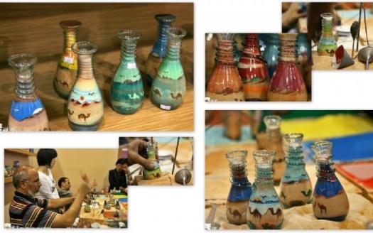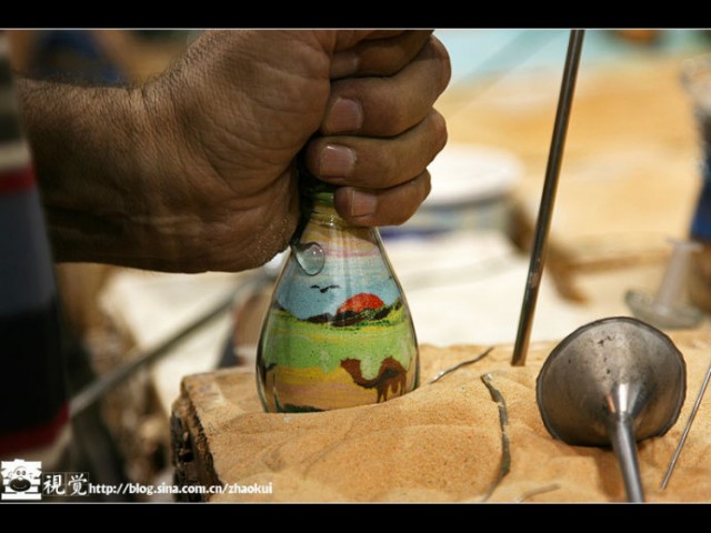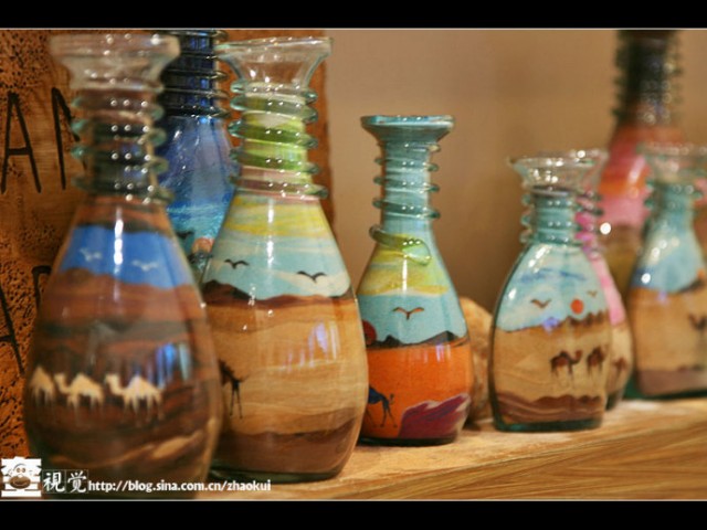 据说从北非的突尼斯、埃及到西亚的约旦、叙利亚,有一种工艺品似乎没有国界,那就是独具特色的沙画瓶。这也许是漫漫无艮的沙漠环境所造就的吧。