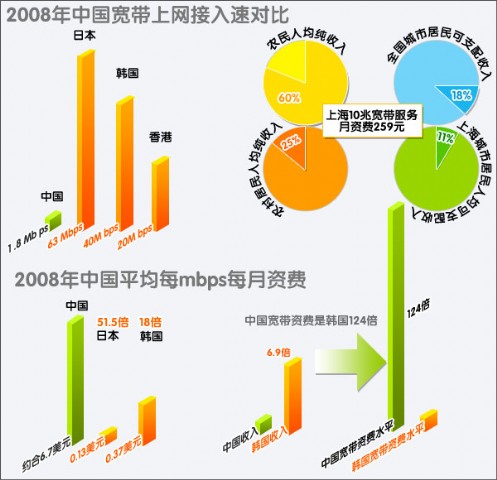统计,2008年, 我国上网接入速率约为1 .8 Mb ps, 远远低于日本的63 Mbps, 韩国的40M bps。2008年,我国宽带用户平均月资费83.8元,相当于每Mbps每月46.6元(约合6.7美元),是韩国宽带价格(0.37美元)的18倍、日本(0.13美元)的51.5倍。