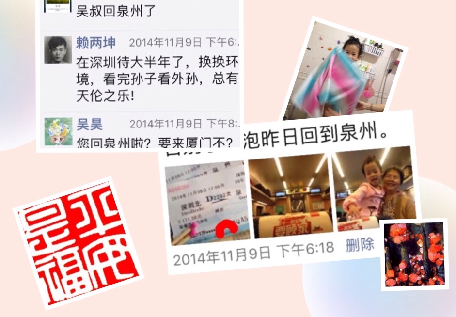 Posted on 8月 10, 2018动车上告别小孙女 20141109微信 昨天五人-约车至动车站-12:00发车-16:25 抵达泉州-青一家来接车-晚餐莜面、炒饭等。鲁仨在厦门北站下车…… 附:20140412 微信 老两口昨抵深圳,(山景车8:55从家出发,20分钟抵达车站。10:19发车,14:28抵达深圳,加萍来接车。)离别8个多月了,三岁小孙女一见到爷爷奶奶竟高兴得直蹦直跳,昨晚还吵着要和爷爷奶奶一起睡……其乐滋滋,啊啊……