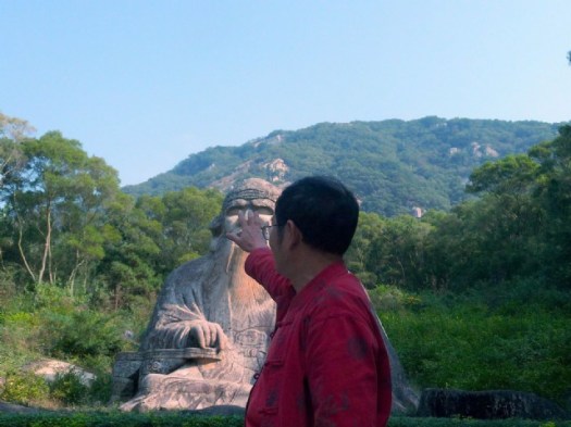那天我们一行游览至坐像前,正有导游给她带团的驴友们拍“摸鼻照”呢。我们也效仿着照张“摸鼻照”留念吧——虽未真摸着鼻子,但也看似摸着鼻子呀!——即使未能活上一百二,一百岁也好呀!长寿之心,人皆有之。哈哈!